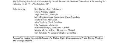 La siguiente Resolución fue adoptada por el Comité Nacional Demócrata en su reunión del 16 de febrero de 2019, en Washington, D.C.